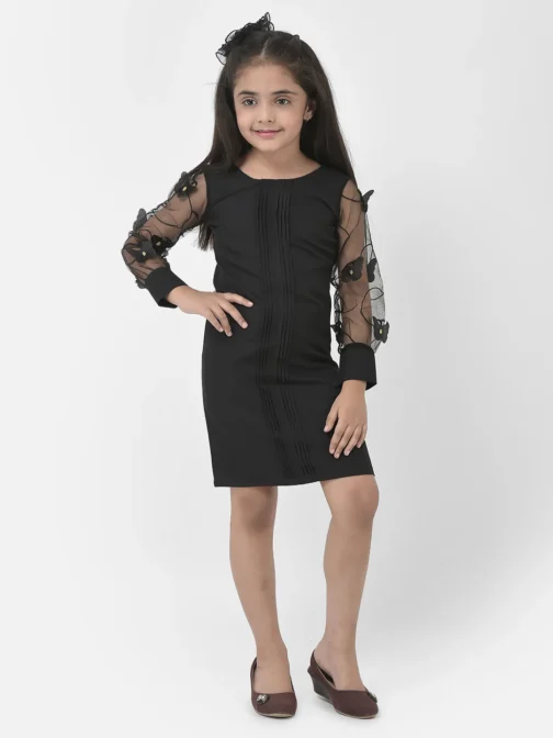 Eavan Girls Black Solid Dress made from crepe fabric, Full sleeves having round neck, 2023 Summer Collection. Material care-Hand wash only