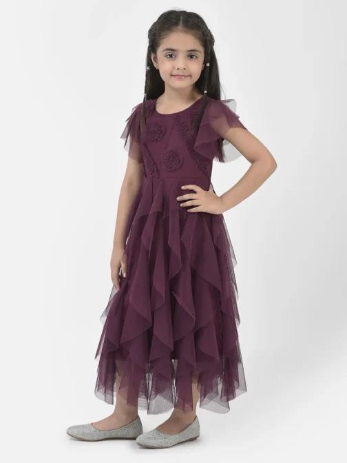 Eavan Girls Burgundy Solid Dress made from net fabric, short sleeves having Neck round neck, 2023 Summer Collection. Material care-Hand wash only