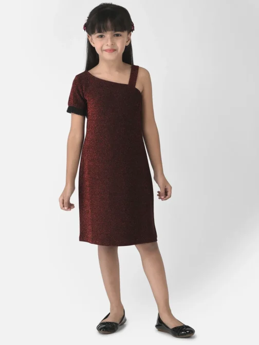 Eavan Girls Maroon Embellished Dress having One Shoulder neckline , Short sleeve and made from Knit fabric