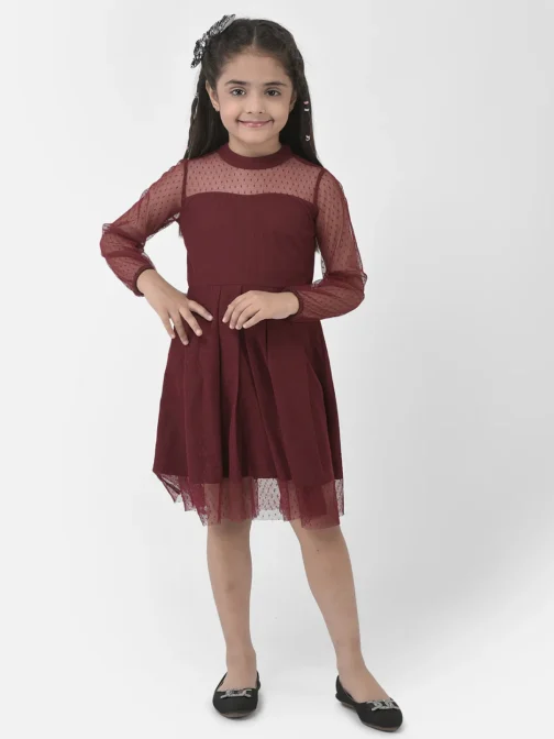 Eavan Girls Maroon Solid Dress made from net fabric, Full sleeves having round neck, 2023 Summer Collection. Material care-Hand wash only