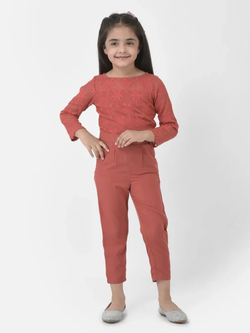 Eavan Girls Rust Embroidered Jumpsuit made from Cotton fabric, Full sleeves having Boat neck, 2023 Summer Collection. Material care-Hand wash only