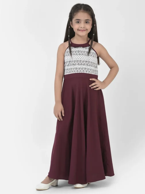 Eavan Girls Burgundy Embroidered Maxi Dress made from Crepp fabric, sleevless having Neck Mandrin collar, 2023 Summer Collection. Material care-Hand wash only