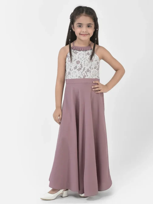 Eavan Girls Light Brown Embroidered Maxi Dress made from Crepp fabric, sleeveless having Madarin collar, 2023 Summer Collection. Material care-Hand wash only