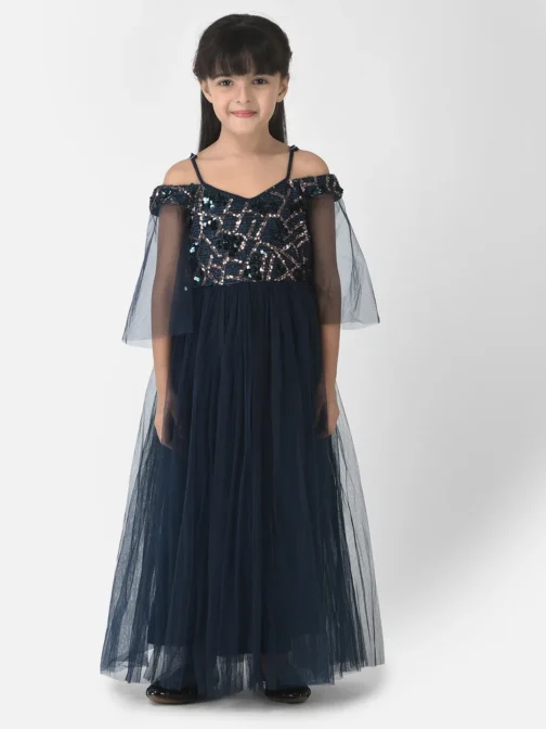 Eavan Girls Navy Blue Embroidered Maxi Dress having Off Shoulder neckline , Full Sleeves and made from Net fabric