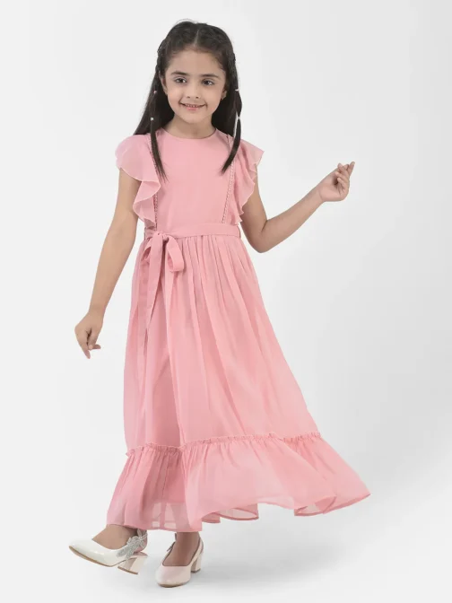 Eavan Girls Pink Solid Draped Saree Gown made from Georgette fabric, short sleeves having round neck, 2023 Summer Collection. Material care-Hand wash only