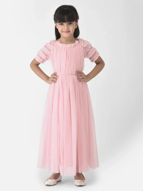 Eavan Girls Pink Solid Maxi Dress having Boat Neck neckline , Short sleeve and made from Net fabric
