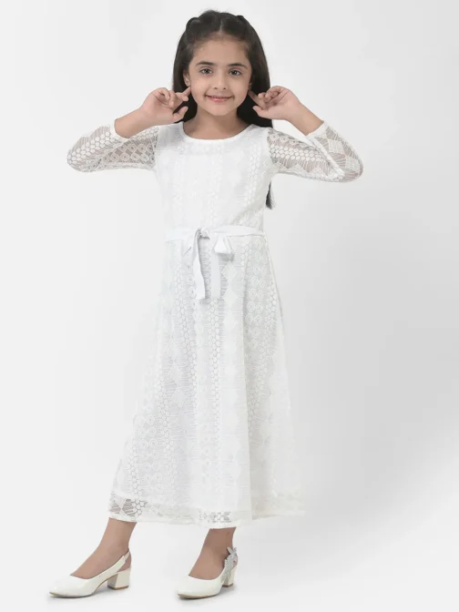 Eavan Girls White Embroidered Maxi Dress made from Net fabric, Full sleeves having round Neck, 2023 Summer Collection. Material care-Hand wash only