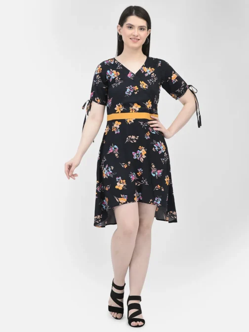 Eavan Women Black Printed Dress made from Rayon Fabric having Above knee V Neck and Short sleeves