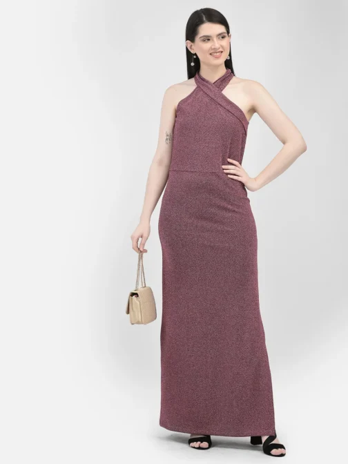 Eavan Women Burgundy Solid Dress made from Lurex Lycra Fabric having Maxi Mandarin Collar and Sleeveless