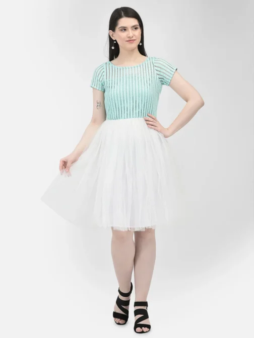 Eavan Women Green & White Solid Dress made from Polyester Fabric having Knee Length Boat Neck and Short sleeves