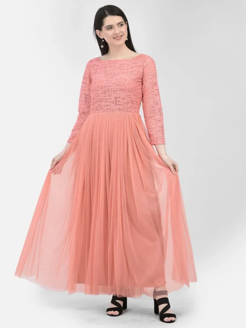 Eavan Women Peach Solid Dress made from Polyester Fabric having Maxi Boat Neck and Full Sleeves