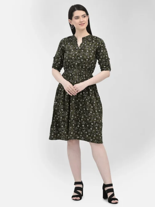 Eavan Women Yellow Solid Dress made from Rayon Fabric having Knee Length Mandarin Collar and Three-fourth quarter sleeves