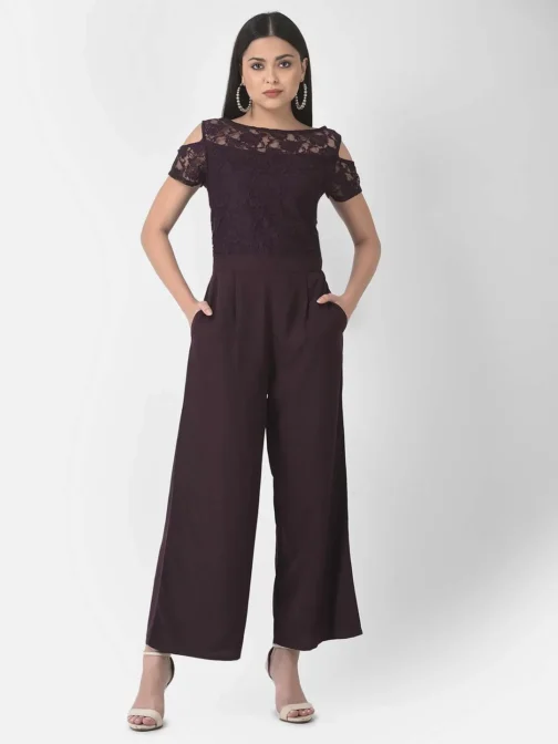 Eavan Women Burgundy Solid Jumpsuit made from Crepe And Net fabric having Burgundycolor and Flared shape, Boat Neck and Half Sleeves. Wash care – Hand Wash only