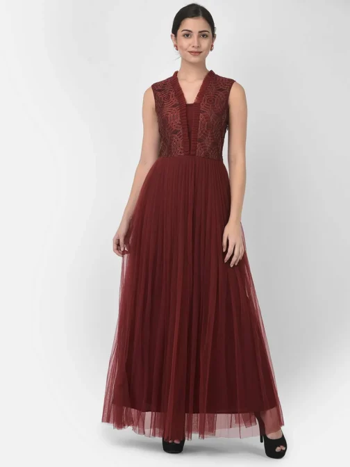 Eavan Maroon Embellished Maxi Dress made from Net Fabric have V-Neck & Sleeveless . Material care – Hand wash