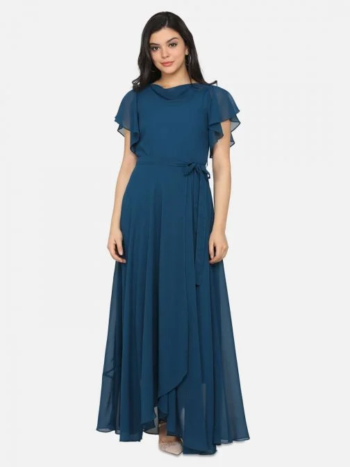 Eavan Teal Blue Cowl Maxi Dress made from Georgette Fabric having Cowl Neck & Short sleeve . Material Care-Dry Clean Only