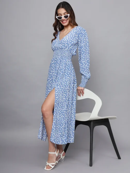 Eavan Women Blue Polka Dot Maxi Dress made from Moss Crepe Fabric Full Sleeves having V Neck 2024 Summer Collection Eavan material care – hand wash only