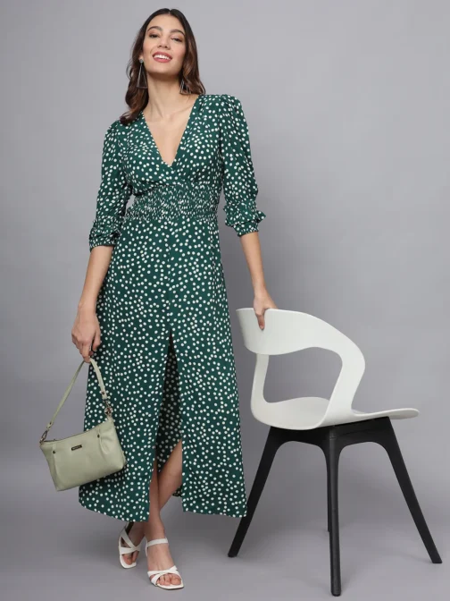 Eavan Women Green Polka Dot Maxi Dress made from Moss Crepe Fabric Quarter Sleeve having V Neck 2024 Summer Collection Eavan material care – hand wash only