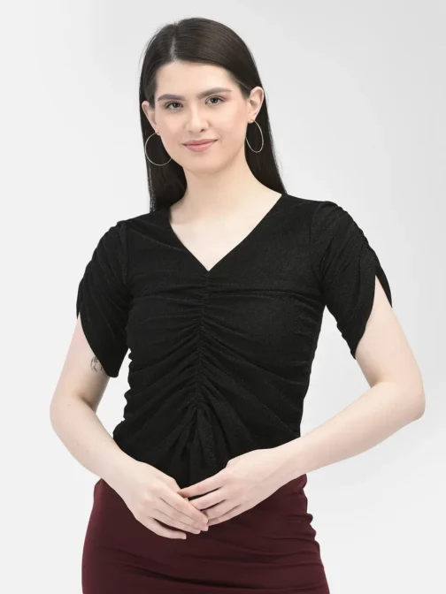 Eavan Women Black Solid Top made from Lurex Lycra Fabric having Regular V Neck and Short sleeves